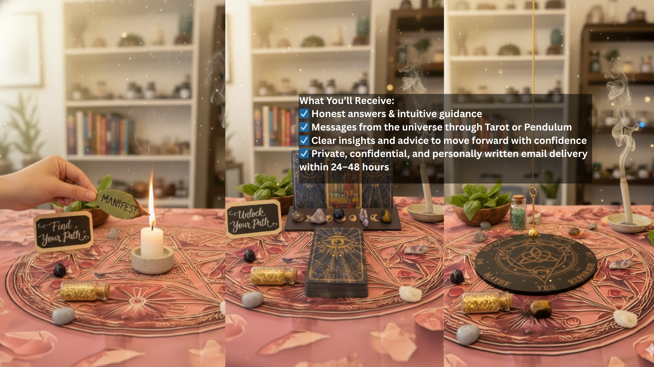 The Universe led you to the message your soul was seeking. Personalized Tarot Readings & Rituals performed with intention, clarity, and divine energy — crafted just for you.